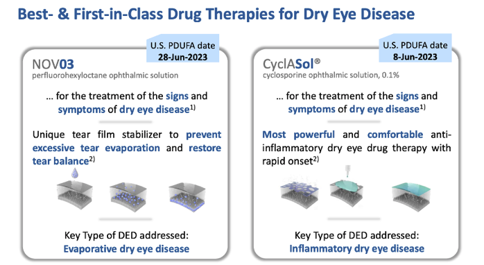 2023年5月18日,博士伦(Bausch+Lomb)和Novaliq GmbH公司宣布,美国FDA批准全氟己基辛烷滴眼液(代号:NOV03)(perfluorohexyloctane ophthalmic solution)上市,用于治疗干眼的体征和症状,这是一种直接针对泪液蒸发的干眼症创新疗法。比此前预定的PDUFA日期2023年6月28日提前。