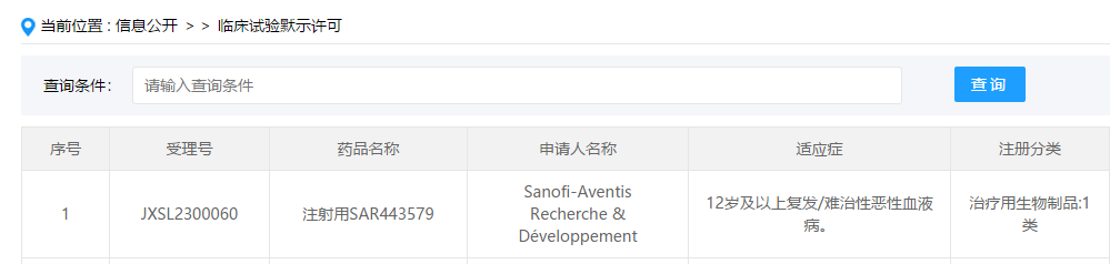 5月31日,据CDE官网显示,赛诺菲NKp46/CD16/CD123三抗注射用SAR443579获得临床试验默示许可,用于治疗12岁及以上复发/难治性恶性血液病。
