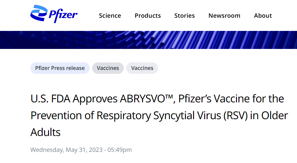 5月31日,辉瑞发布公告:美国FDA已批准其呼吸道合胞病毒(RSV)二价疫苗Abrysvo(RSVpreF,PF-06928316)上市,用于预防60岁及以上人群出现由RSV引起的下呼吸道疾病(LRTD)。