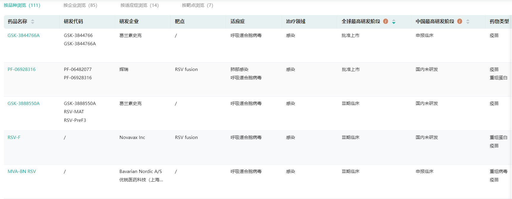 全球RSV疫苗研发(部分,完整内容请登录“药融云数据库www.pharnexcloud.com/?mh”查看)
