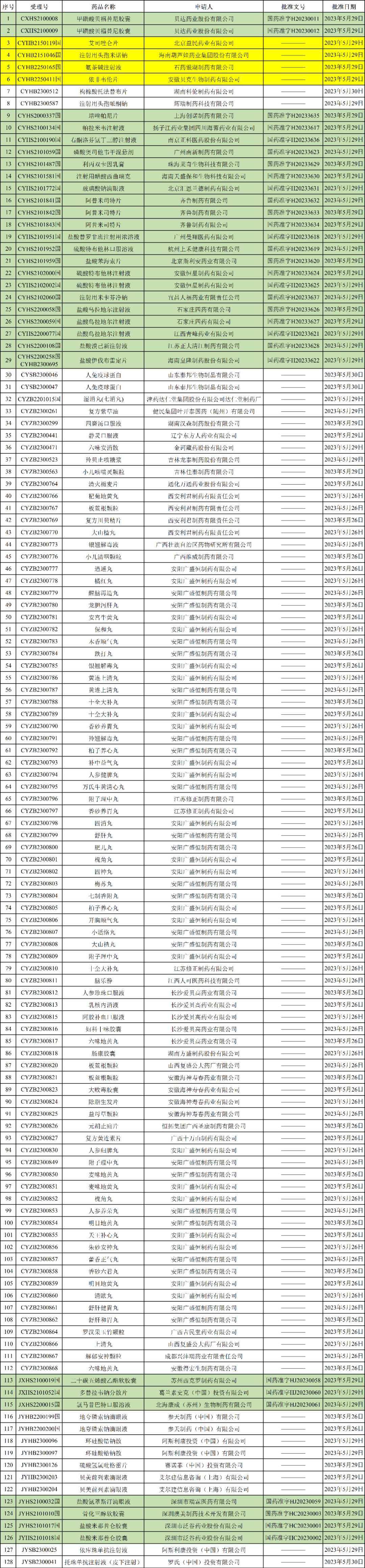 NMPA发布2023年06月02日药品批准证明文件送达信息,本批次共有128个受理号获批,其中包括4个一致性评价受理号,为: