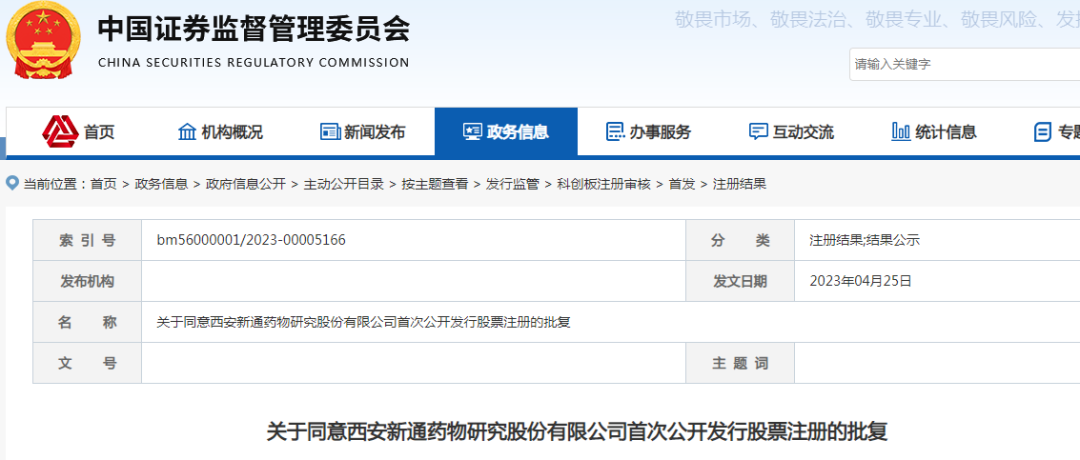 2023年4月25日,中国证监会发布了同意西安新通药物研究股份有限公司(简称:新通药物)首次公开发行股票并在科创板上市的批复。