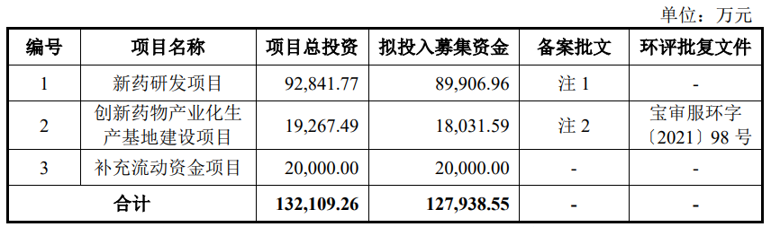 新通药物计划募资12.79亿元,其中,9亿元用于新药研发项目,1.8亿元用于创新药物产业化生产基地建设项目,2亿元用于补充流动资金项目。