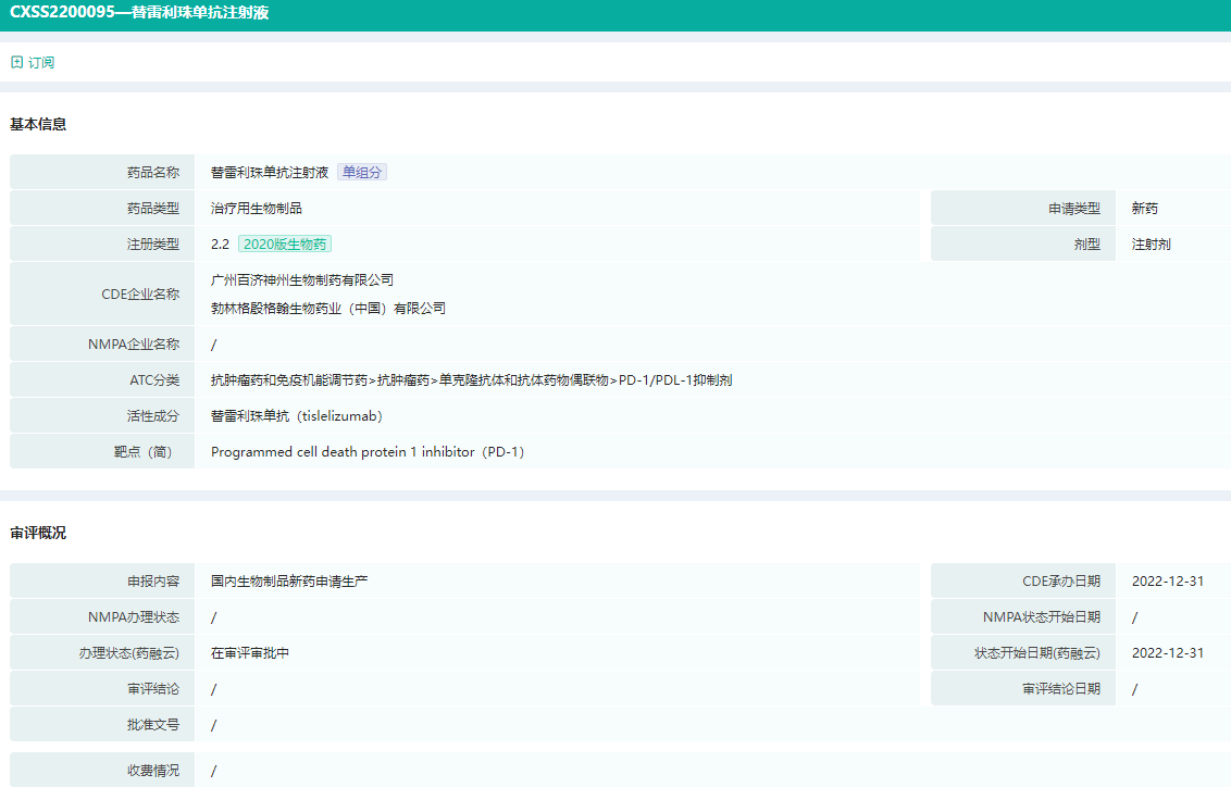 订阅替雷利珠单抗(受理号CXSS2200095)可获取一手动态