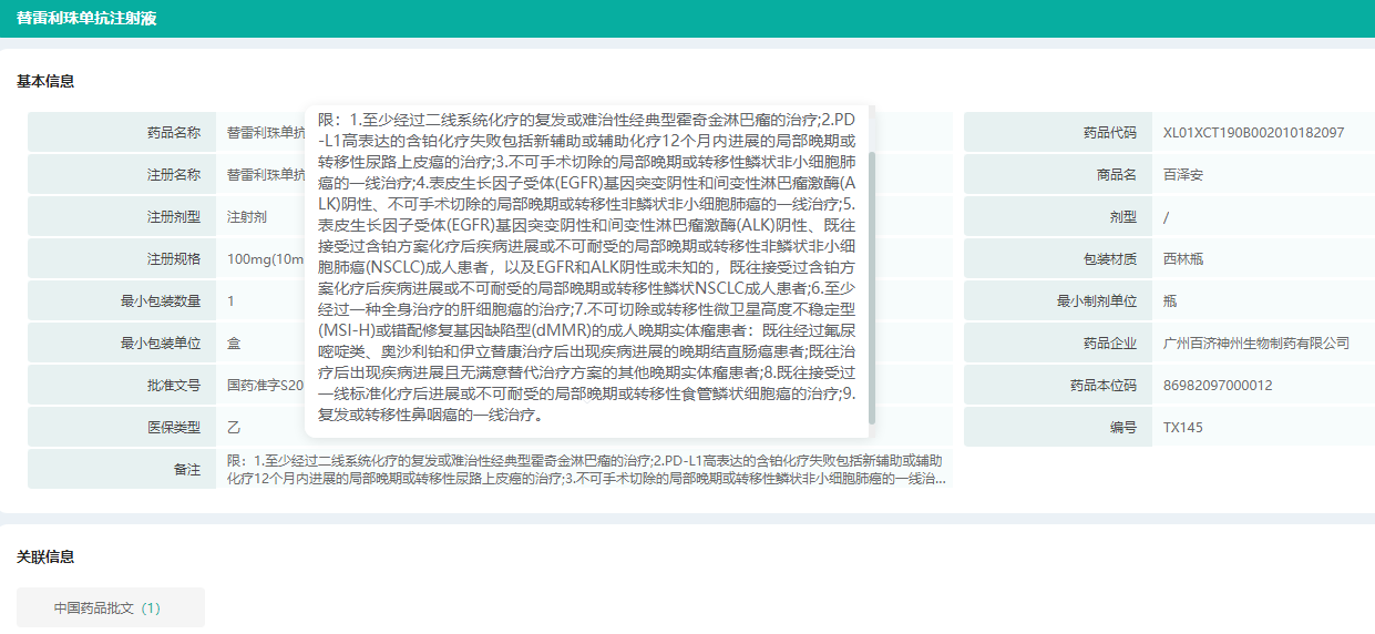 替雷利珠单抗-医保药品分类和代码查询