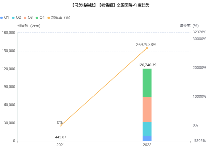 据药融云数据库统计,2022年司美格鲁肽在我国院内销售额暴涨,一举突破十亿大关。据诺和诺德财报,在中国市场,诺和诺德2022年和2023年Q1所占的GLP-1市场份额均在65%左右,其中,司美格鲁肽2023年Q1销售额达到8.7亿元。