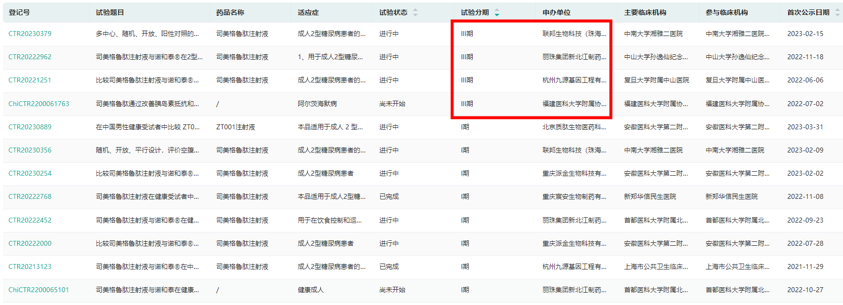 司美格鲁肽生物类似药国内药企临床开展情况(部分,完整内容请登录“药融云数据库www.pharnexcloud.com/?mh”查看)