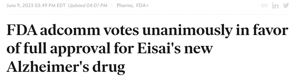 咨询委员会的投票虽然没有约束力,但FDA通常遵循委员会的建议。这种一致的支持表明,FDA可能会在7月6日或之前全面批准该药物。这将为那些患有轻度认知障碍或轻度痴呆并确认存在β淀粉样蛋白病理但不能或不想支付每年26,500美元定价的患者提供更广泛的保险和医疗保险覆盖。