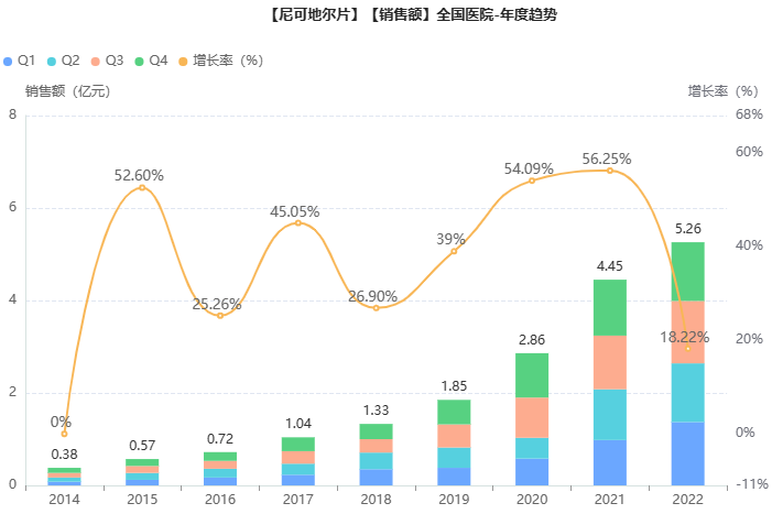 据药融云全国医院销售数据库显示,尼可地尔片近年来的销售额呈阶梯式增长,2022年已超5亿,同比增长18%,其中原研中外制药株式会社占据近半壁江山,其次为西安汉丰药业(27.2%)、天方药业(14.61%)市场占比较高。