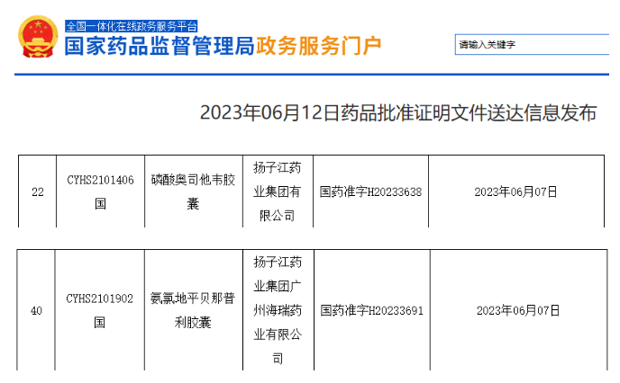 6月12日,NMPA发布新一批药品批准证明文件送达信息,其中,扬子江药业拿下两大亿元品种,视同通过一致性评价,分别为磷酸奥司他韦胶囊和氨氯地平贝那普利胶囊,其中后者为7亿品种新剂型的国内首仿药。