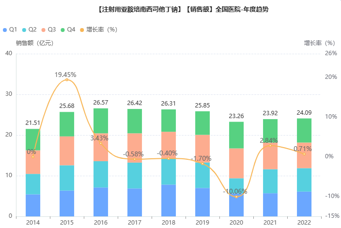 据药融云数据库,该品种在国内仅有注射用亚胺培南西司他丁钠一个制剂获得批文,近年来院内销售额均在20亿元以上,2022年为24亿元,默沙东市场份额最高(约8成),其次为瀚晖制药、珠海联邦制药等。