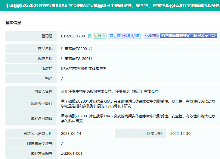 据药融云数据库,泽璟制药1类新药甲苯磺酸ZG2001片近日启动了I/II期临床试验,旨在研究甲苯磺酸ZG2001片在携带KRAS突变的晚期实体瘤患者中的耐受性、安全性、有效性和药代动力学。