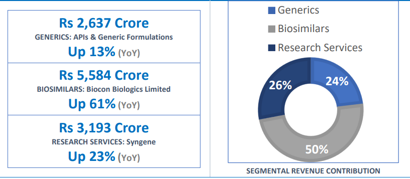 因为这笔交易,Biocon的销售额实现了大幅上涨,2023财年(2022Q2-2023Q1)总营收达1155.0亿卢比(约合14.23亿美元,年平均汇率),同比增长38%。税息折旧及摊销前利润(EBITDA)288.8亿卢比(约合3.56亿美元),同比上涨32%。
