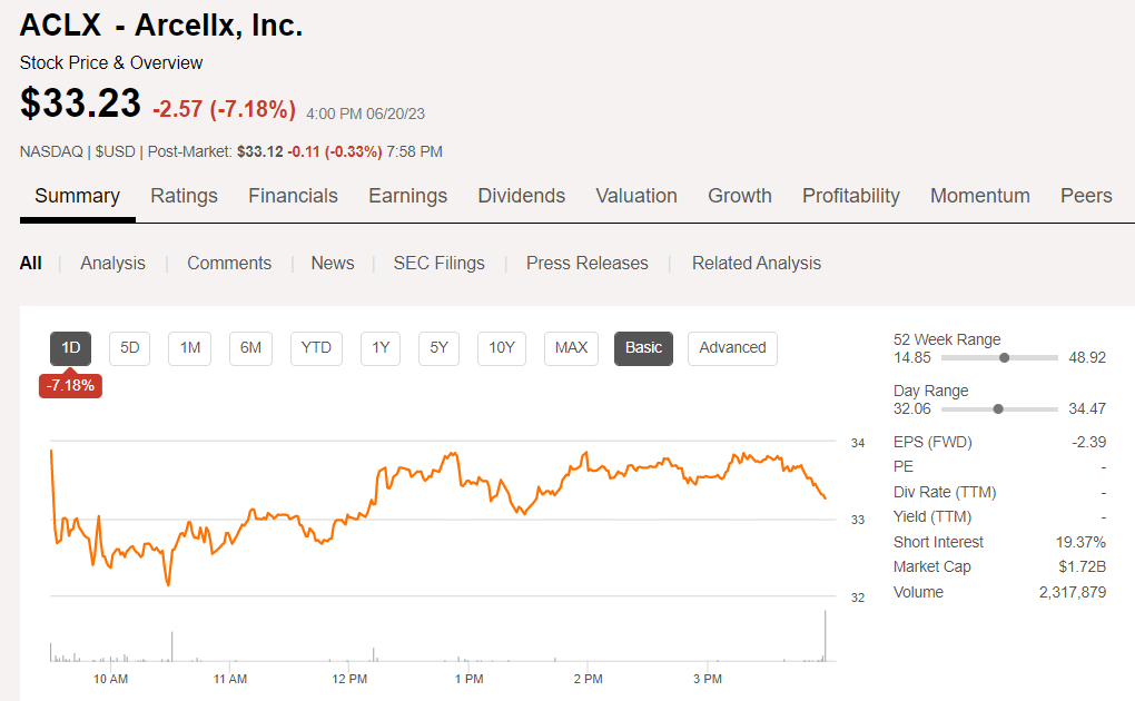 受此影响,Arcellx股价下跌7%。Arcellx于2022年在纳斯达克上市,目前股价为33.23美元,市值为17.2亿美元。