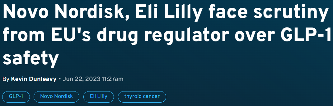 6月22日,据fiercepharma报道,欧洲药品管理局(EMA)已将GLP-1药物标记为甲状腺癌的潜在风险,包括诺和诺德的Ozempic和Wegovy,以及礼来的Mounjaro。监管机构要求公司在7月26日之前提交更多信息。欧洲药品管理局已经加强了对GLP-1治疗的审查,提出了一个关于糖尿病和肥胖药物可能导致癌症的潜在风险的安全信号。