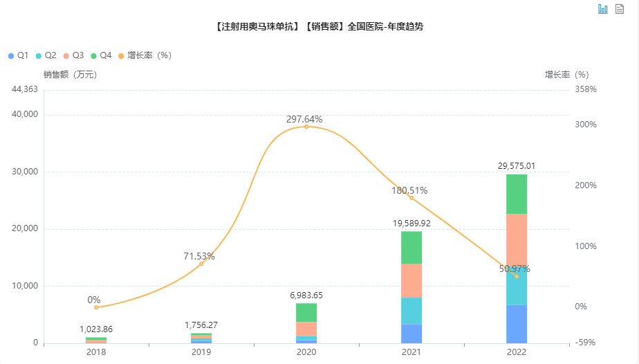 而在国内,奥马珠单抗市场表现也不俗,销售额一路走高。据药融云数据库统计,2022年奥马珠单抗的院内销售额同比增长51%,已近3亿元。这不仅是由于其被纳入医保乙类,也与其适应症的不断拓展有关: