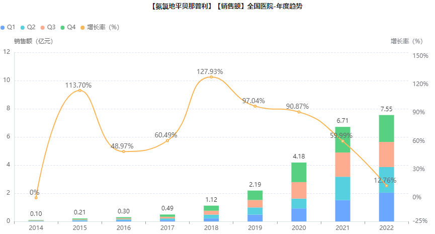 盐酸奈康唑是一种新型咪唑类抗真菌药物,具有抑菌和杀菌双重功效,用于治疗癣菌病、皮肤念珠菌病、花斑癣等真菌。原研为日本久光制药,1993年在日本首次上市,未进入中国市场。氨氯地平贝那普利为复方降压药,近年来在国内医院端市场呈高速增长态势,2022年在国内医院终端销售规模为7.55亿元,同比增长12.76%。