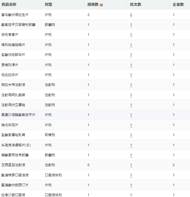 富马酸丙酚替诺福韦片与注射用伏立康唑,均有9家生产厂家获批。其中,富马酸丙酚替诺福韦片获批的企业包括苏州东瑞制药、苏州弘森药业、重庆药友制药、山东朗诺制药等;注射用伏立康唑获批的企业包括北京双鹭药业、浙江华海药业、扬子江药业、丽珠集团等。