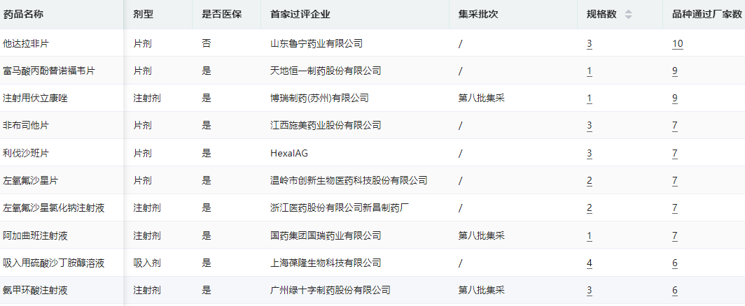 位列第一的是他达拉非片,2023年上半年有河南羚锐制药、修正药业、常州制药厂、江苏联环药业、扬子江药业、云南先施药业、山东鲁宁药业.....等10家企业获得其生产批文。
