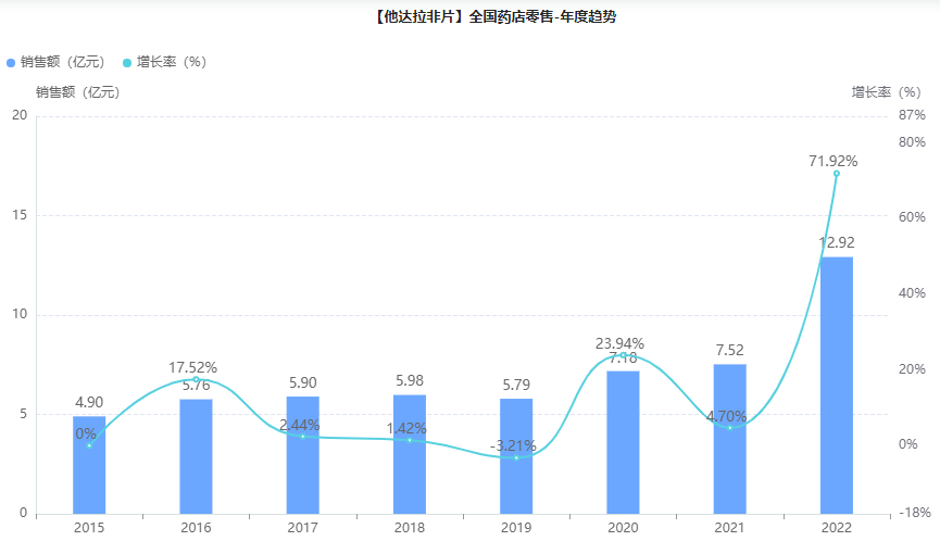药融云全国药店零售数据库显示,2022年他达拉非片在零售市场的销售规模为12.92亿元,同比增长71.92%。其中,意大利美纳里尼占据37.55%的市场份额,天士力帝益药业占比26.84%,原研礼来占比16.98%,齐鲁制药占比6.11%。