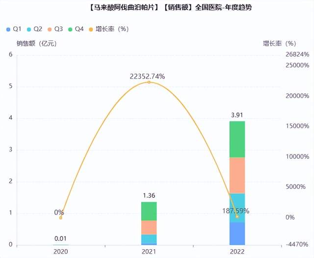 据药融云数据库显示,苏可欣自上市后便开始了高速放量,上市次年院内销售额便突破1亿元,2022年达3.9亿元,同比增长187%。目前,阿伐曲泊帕仅原研一家拥有批文。
