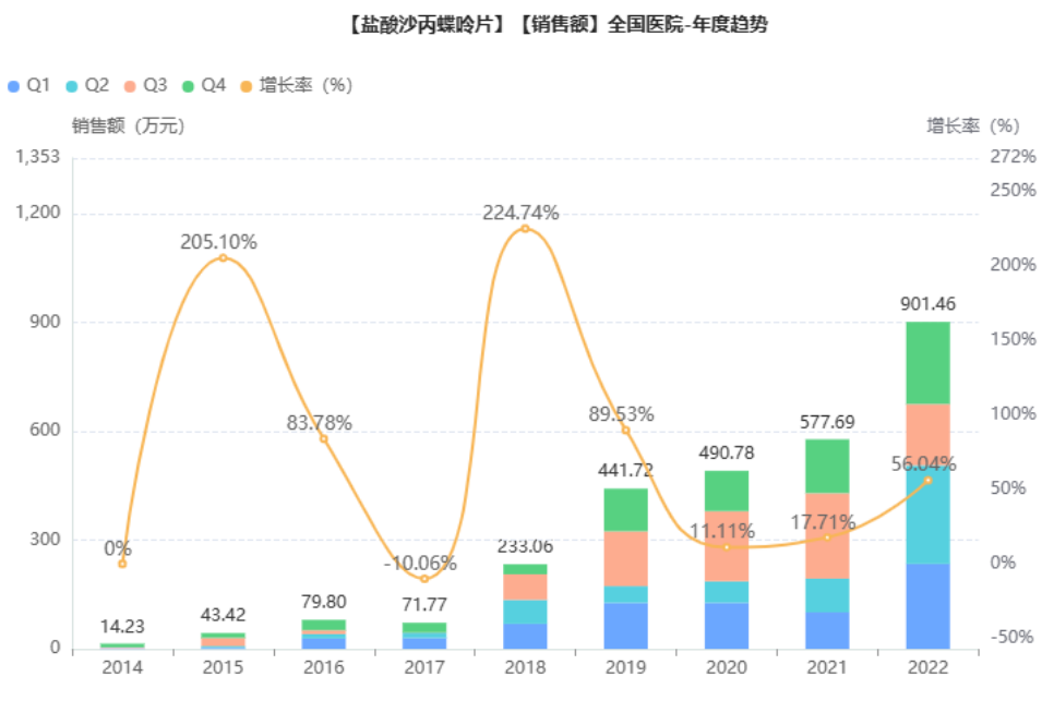 盐酸沙丙蝶呤片是目前治疗高苯丙氨酸血症这一罕见病的唯一药物,适用于对本品治疗有反应的四氢生物蝶呤(BH4)缺乏症所导致的高苯丙氨酸血症(HPA)。该药物原研于2007年由美国食品药品监督管理局批准上市,2011年获得中国国家市场监督管理总局(原中国食品药品监督管理局)的上市批准,该药物30片装售价大概7480元。2022年,该药物院内销售额约900万元。