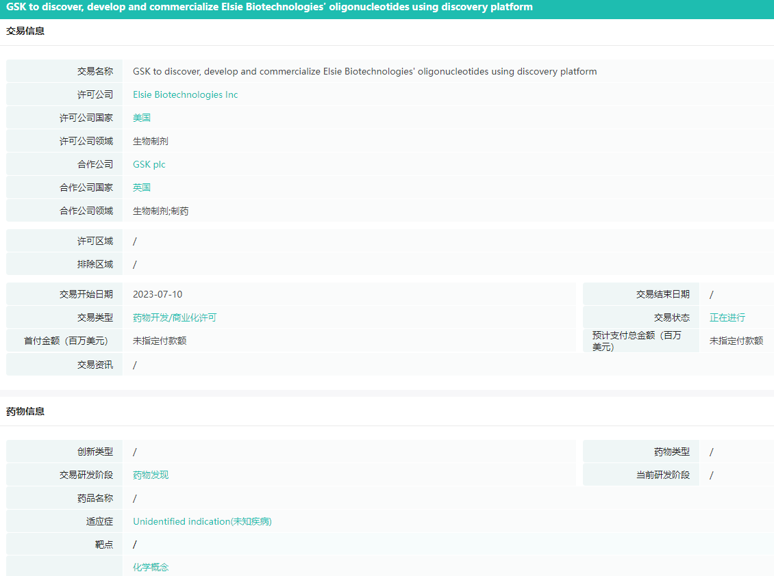 7月12日,ElsieBiotechnologies宣布了与GSK的一项研究合作协议,该合作旨在推进Elsie公司创新寡核苷酸发现平台的开发,目的是找到在安全性、有效性和递送等方面都经过优化的新型寡核苷酸。ElsieBiotechnologies致力于通过整合药物发现、开发和递送环节来发挥寡核苷酸疗法的全部潜力,以提升治疗效果、降低毒性、并优化递送过程。