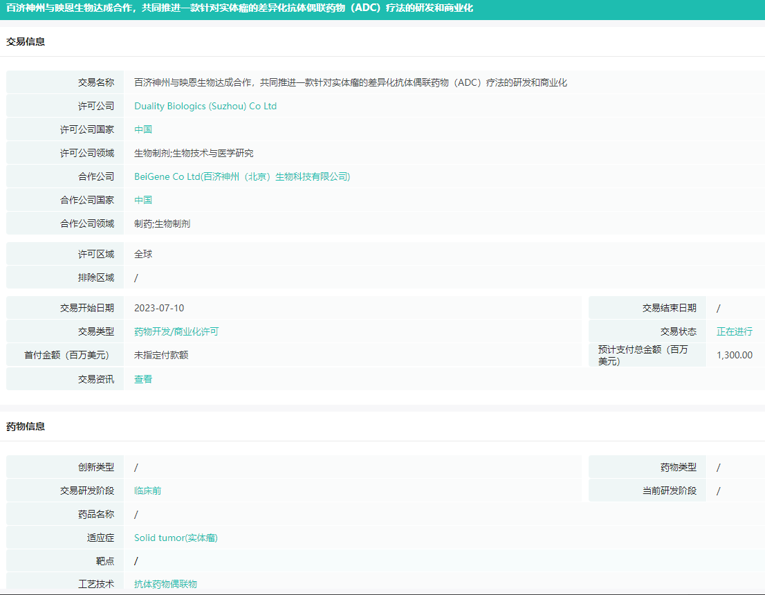 药融云全球医药交易数据库显示,7月11日,百济神州(BeiGene)与映恩生物(DualityBio)宣布达成一项独家选择权和授权合作协议,百济神州获得一款在研、临床前抗体偶联药物(ADC)的全球开发和商业化权利,该药物将用于治疗特定实体瘤患者。