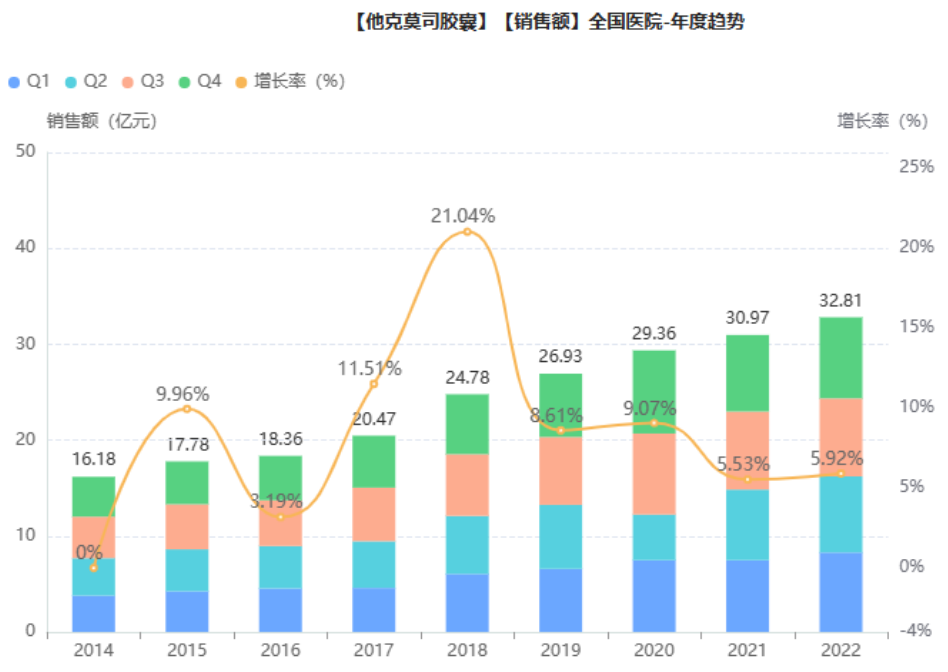 在国内,他克莫司已有胶囊剂、滴眼液、颗粒、注射液、软膏等多种制剂获批上市,其中他克莫司胶囊为主要销售品种,市场份额占比超8成。据药融云数据库,他克莫司胶囊院内销售额持续走高,从2016年的16亿元翻倍至2022年的32.8亿元,年复合增长率达9.23%。