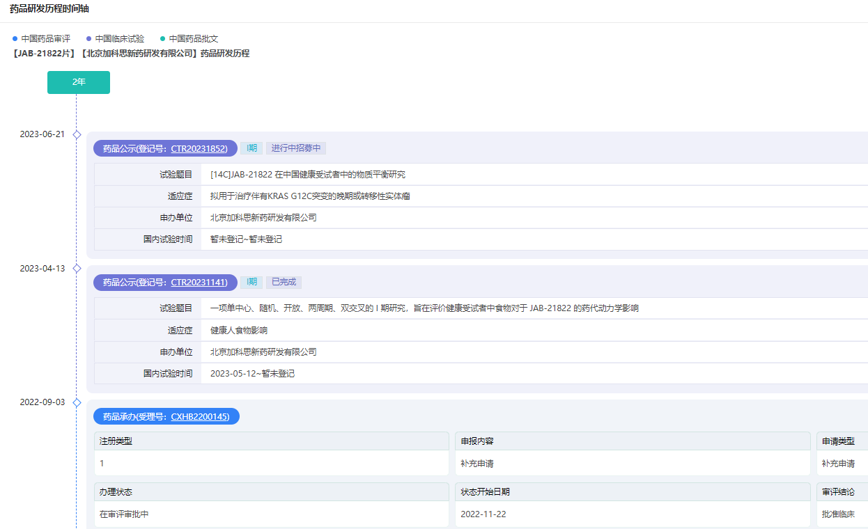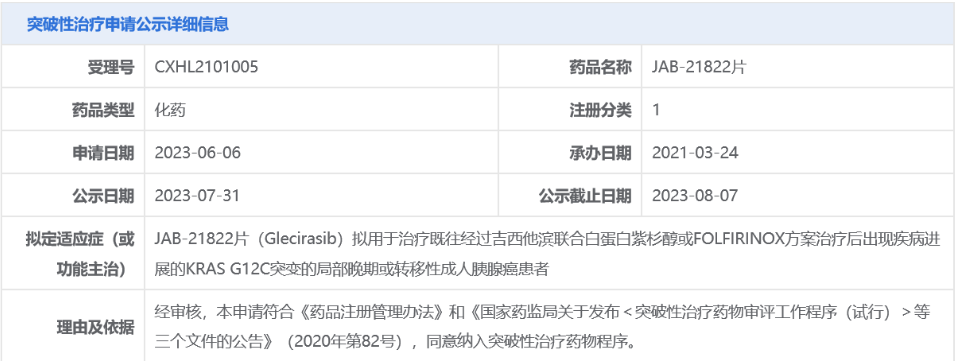 公开资料显示,JAB-21822是一种KRAS p. G12C共价抑制剂,此前其针对KRAS p. G12C突变局部晚期或转移性非小细胞肺癌(NSCLC)的适应症已被CDE纳入突破性治疗品种。