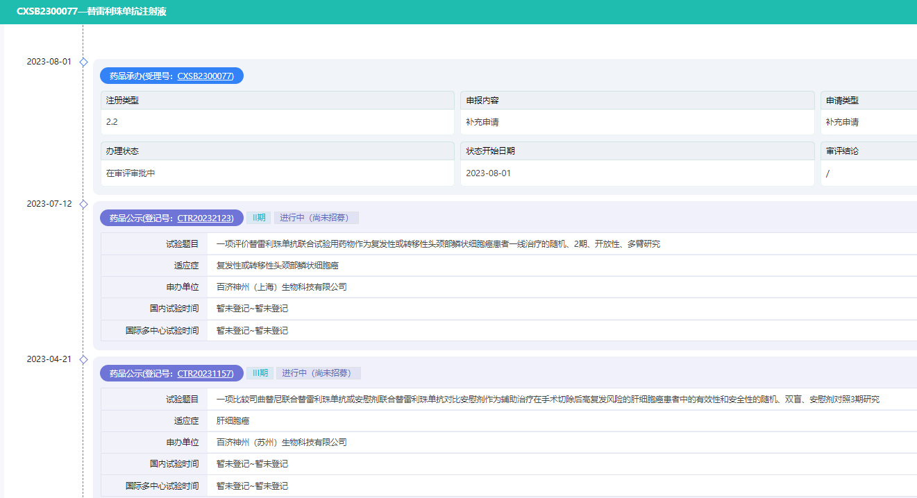 据药融云数据库,替雷利珠还有多项II期、III期临床试验开展中,适应症包括头颈部鳞状细胞癌、宫颈癌等。其递交的第12项适应症:治疗一线不可切除或转移性肝细胞癌(HCC)正在审评中