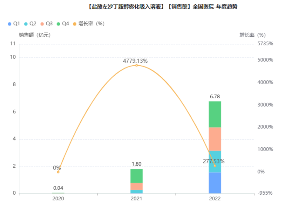 药融云数据库显示,2021年该品种市场快速打开,院内销售额快速攀升至1.8亿元,2022年达6.78亿元,同比增长278%,一副“黑马之姿”。其中,健康元药业市场优势明显,占据绝大多数份额。