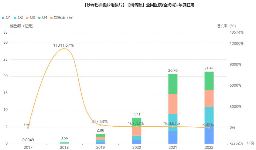 目前国内用于高血压的ARNi类药物仅诺华的沙库巴曲缬沙坦钠片(商品名:诺欣妥),药融云全国医院销售(全终端)数据库显示,2022年诺欣妥在国内医院市场的销售规模达到21.41亿元。