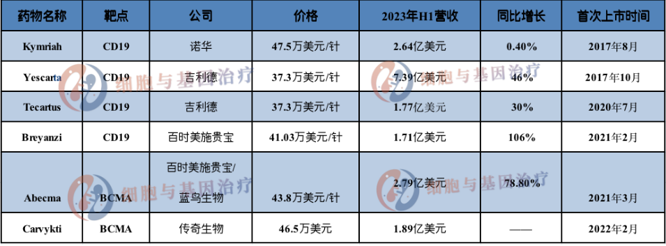 根据2023上半年销售数据来看,吉利德两款CAR-T疗法实现了超9亿美元的最高销售额,BMS的两款CAR-T疗法增势迅猛,Abecma和Breyanzi增长分别为78.8%,106%。