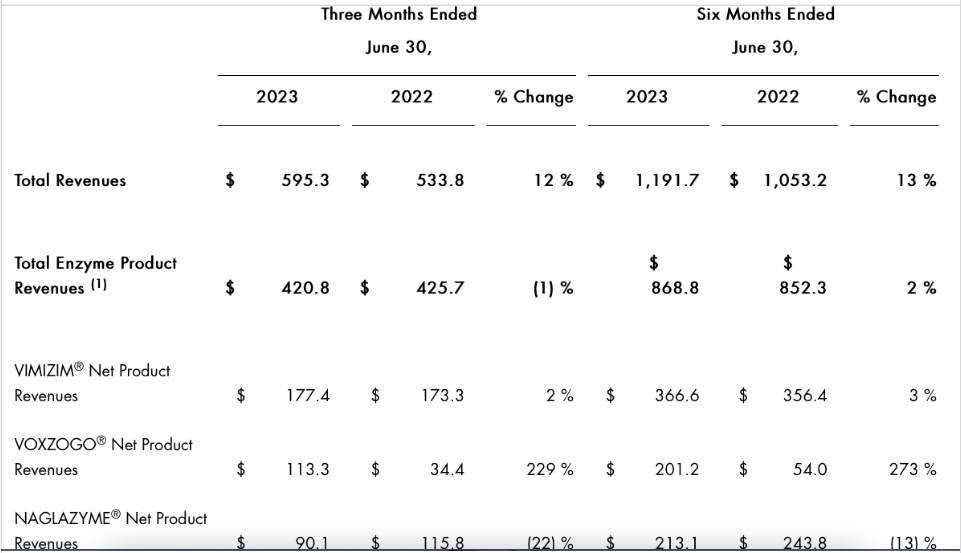 近日,罕见病龙头公司BioMarin Pharmaceutical Inc. (NASDAQ: BMRN) 公布2023年H1财报。财报显示,2023H1总收入11.92亿美元(85.48亿人民币,按最新汇率1 美元 ≈ 7.1708 人民币计算),同比增长13%,现金及现金等价物15.57亿美元(111.65亿人民币)。