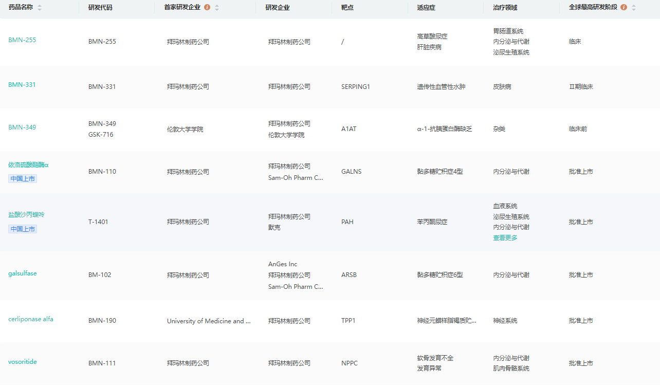 BioMarin的研发管线(部分)