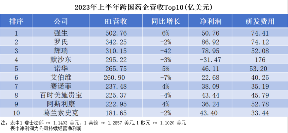 随着跨国药企2023第二季度财报的披露,我们汇总了10大药企2023年上半年的营收、净利润、研发费用情况。