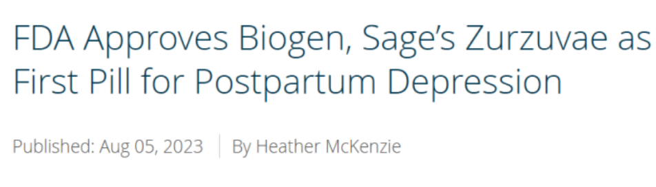 近期,FDA批准了百健(Biogen)和Sage Therapeutics公司共同开发的Zurzuvae(zuranolone)上市作为治疗产后抑郁症的首款口服药物,但拒绝了对重度抑郁症(MDD)治疗的上市批准。