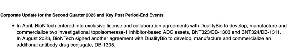 4月,BioNTech与映恩生物签订了独家许可和合作协议,以开发、制造和商业化两种基于研究性拓扑异构酶-1抑制剂的ADC资产,BNT323/DB-1303和BNT324/DB-1311。