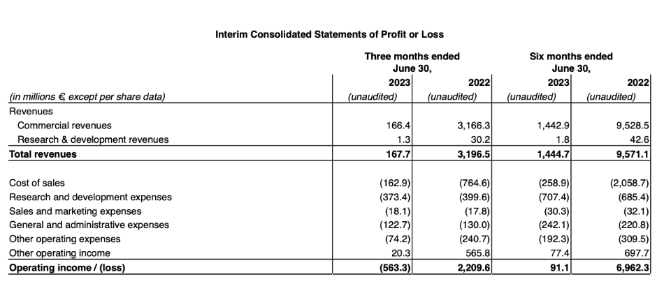 今日,BioNTech公布了其2023年H1财报。财报显示,2023上半年,公司总营收14.45亿欧元(114.32亿人民币,按最新汇率1 欧元 =7.90 人民币计算),同比下降84.9%。