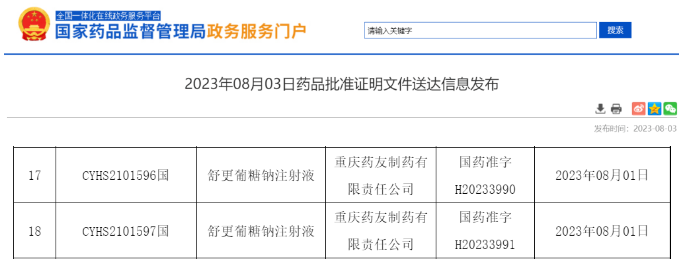 2022年4月,扬子江药业的舒更葡糖钠注射液成功获批上市(视同通过一致性评价),拿下国内首仿。获批第2家为湖南科伦制药,第3家为苑东生物,第4家为贵州益佰制药,第5家为浙江仙琚制药,第6家为西安汉丰药业,第7家为宜昌人福药业,第8家为南京泽恒医药,第9家为江苏悦兴医药。