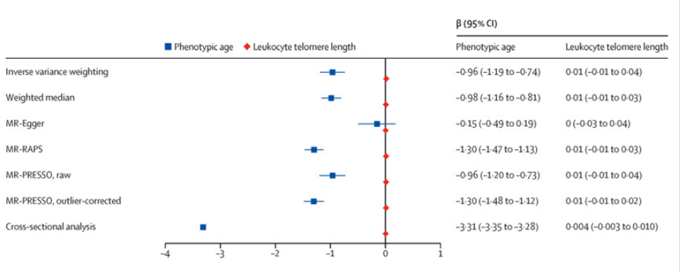 衰老的标志物,其实还没有一个最优的公论,研究者们确定的主要结局为表型年龄(PhenoAge),次要结局为白细胞端粒长度。表型年龄会随实际年龄增加,白细胞端粒长度随年龄缩短。