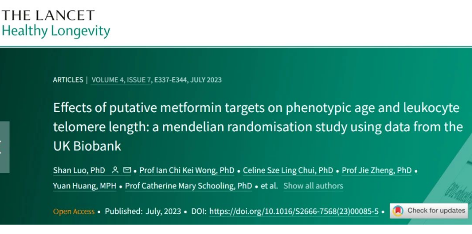 2023 年 7 月,香港大学李嘉诚医学院公共卫生学院联合上海交通大学医学院附属瑞金医院等单位的研究人员 The Lancet Healthy Longevity 杂志发表了题为 Effects of putative metformin targets on phenotypic age and leukocyte telomere length: a mendelian randomization study using data from the UK Biobank 的文章,探索二甲双胍是否可以用于促进健康老龄化。这是全球范围内首个全面探索二甲双胍对衰老生物标志物的靶点特异性效应的孟德尔随机化研究之一。