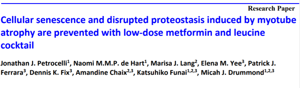 今年4月《衰老》(Aging)杂志的一篇封面文章,就重点介绍了低剂量的二甲双胍和亮氨酸联用时,可以预防骨骼肌萎缩引起的细胞衰老和蛋白质稳态破坏现象。