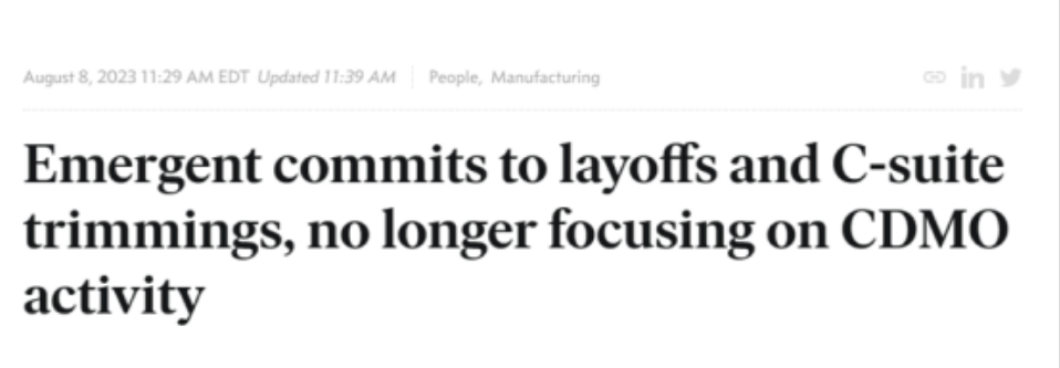 2023年8月8日,Emergent BioSolutions (NYSE: EBS)宣布,将减少对其CDMO服务业务的投资,并不再强调其增长,同时公司将裁员400余人。