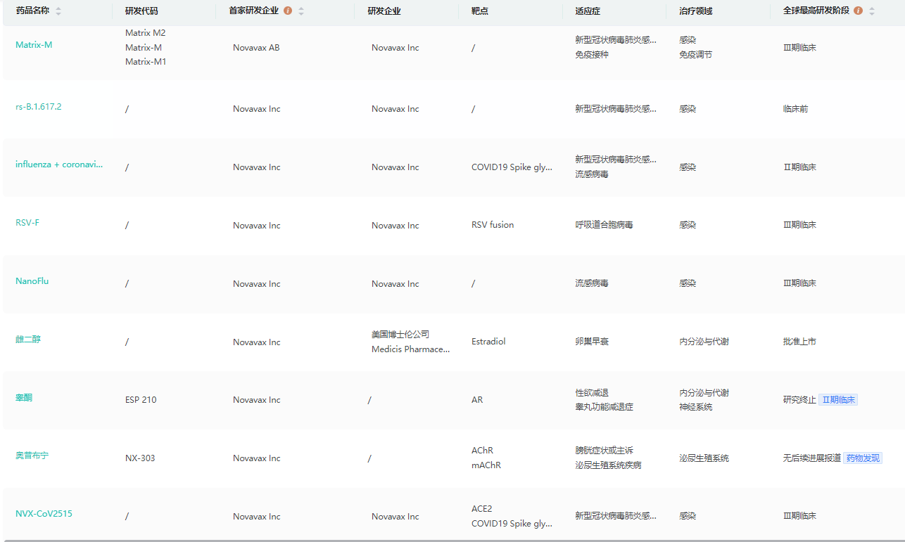 Novavax研发管线(部分)