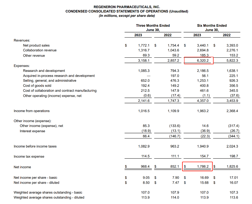 8月3日,再生元发布2023H1财报,今年上半年营收63.2亿美元(455.79亿人民币),同比增长8.6%,净利润17.86亿美元(128.80亿人民币),同比下降2.2%,现金及现金等价物152.55亿美元(1,100.18亿人民币)。