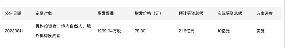 药融云数据库据悉,美迪西8月11日公告称,定增募资已完成,募资总额10.0亿元,发行数量为1269.04万股,增发价格为78.8元/股。