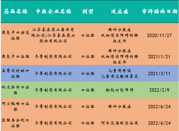 膜剂中,6个都是口溶膜;从ATC分类看,4个神经系统用药,1个呼吸系统用药,1个泌尿系统药物;从生产企业来看,有5个品种是齐鲁制药的,豪森药业有1个。