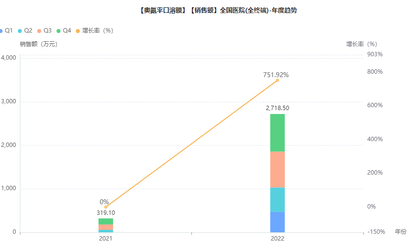 作为中国市场上精神用药龙头老大,国内医院市场的奥氮平产品有奥氮平片、奥氮平口崩片、奥氮平口溶膜。据药融云全国医院销售(全终端)数据库显示,齐鲁制药的奥氮平口溶膜2022年在医院终端市场的销售规模为2718.50万元,同比增长751.92%。